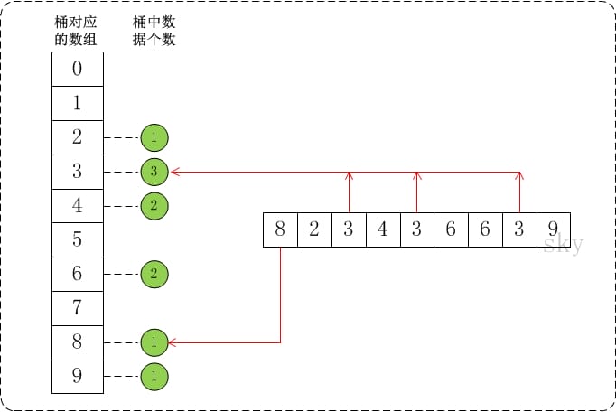 假设a={8,2,3,4,3,6,6,3,9}, max=10。此时,将数组a的所有数据都放到需要为0-9的桶中。如下图: