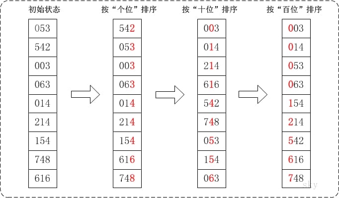 通过基数排序对数组{53, 3, 542, 748, 14, 214, 154, 63, 616},它的示意图如下: