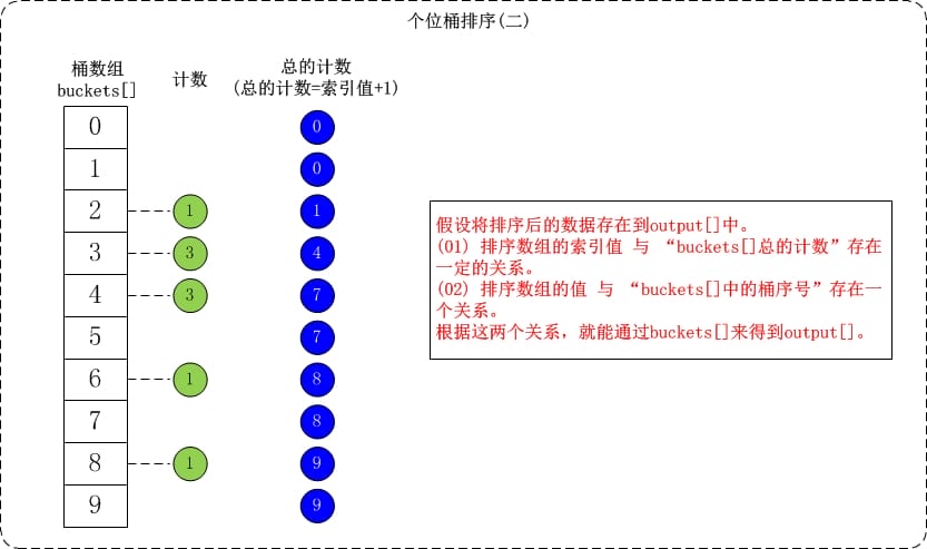 - 接着是根据桶数组buckets[]来进行排序。假设将排序后的数组存在output[]中;找出output[]和buckets[]之间的联系就可以对数据进行排序了。