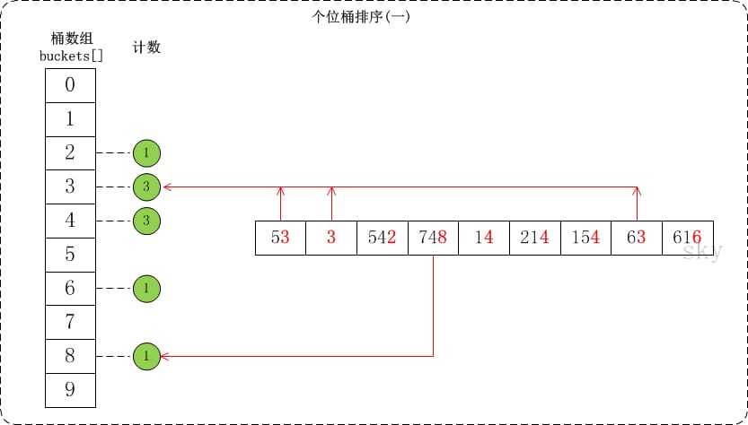 - 个位的数值范围是[0,10)。因此,参见桶数组buckets[],将数组按照个位数值添加到桶中。