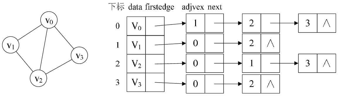 PS: 对于无向图来说,使用邻接表进行存储也会出现数据冗余的现象。例如上图中,顶点V0所指向的链表中存在一个指向顶点V3的同事,顶点V3所指向的链表中也会存在一个指向V0的顶点。