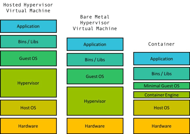 虚拟机由某些特定的硬件和内核虚拟化组成,运行客户操作系统。称为管理程序的软件创建虚拟化硬件,其可以包括虚拟磁盘,虚拟网络接口,虚拟 CPU 等。虚拟机还包括可以与此虚拟硬件通信的宾客内核。管理程序可以托管,这意味着它是一些在主机操作系统(MacOS)上运行的软件,如示例中所示。它也可以是裸机,直接在机器硬件上运行(替换你的操作系统)。无论哪种方式,管理程序方法都被认为是重量级的,因为它需要虚拟化多个部分(如果不是全部硬件和内核)。