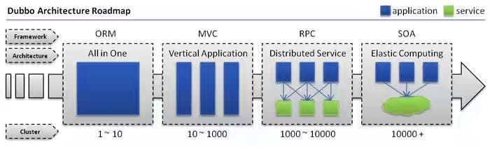 由于分布式系统十分复杂,因此产生了大量的用于简化分布式系统开发的分布式中间件和分布式数据库,服务化的架构设计理念也被越来越多的公司所认同。如下是 Dubbo 官方文档公布了一张有关 SOA 系统演化过程的图片:
