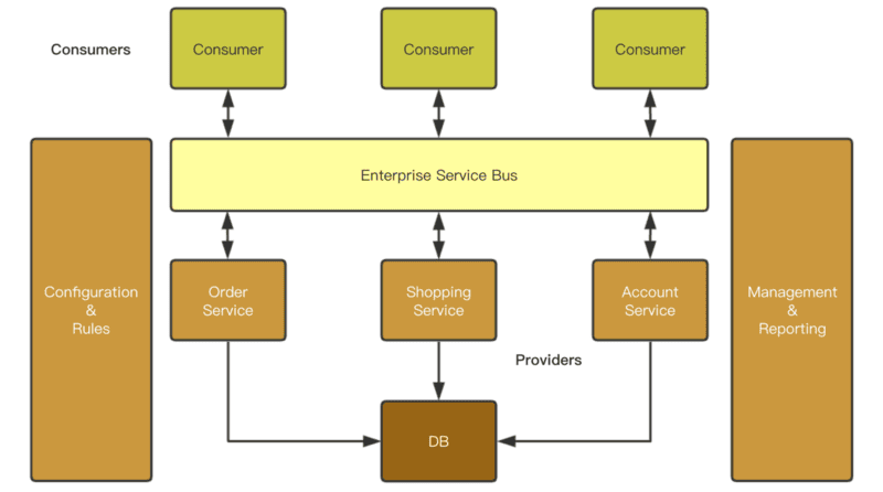 服务消费者(Service Consumer)可以通过发送消息来调用服务,这些消息由一个服务总线(Service Bus)转换后发送给适当的服务实现。这种服务架构可以提供一个业务规则引(Business Rules Engine),该引擎容许业务规则被合并在一个服务里或多个服务里。这种架构也提供了一个服务管理基础(Service Management Infrastructure),用来管理服务,类似审核,列表(billing),日志等功能。此外,该架构给企业提供了灵活的业务流程,更好地处理控制请求(Regulatory Requirement),例如 Sarbanes Oxley(SOX),并且可以在不影响其他服务的情况下更改某项服务。