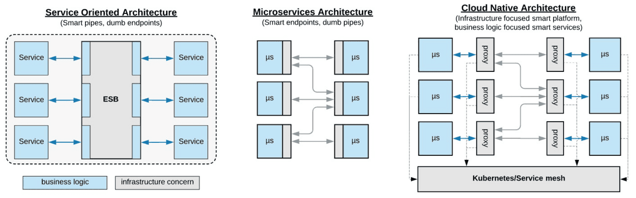 对于微服务,不同背景的人也有不同的见解,对于熟悉 SOA 的开发者,微服务也可以认为是去除了 ESB 的 SOA 的一种实现方案;ESB 是 SOA 架构中的中心总线,设计图形应该是星形的,而微服务是去中心化的分布式软件架构。SOA 更多强调重用,而微服务偏向于重写。SOA 偏向水平服务,微服务偏向垂直服务;SOA 偏向自上而下的设计,微服务偏向自下而上的设计。