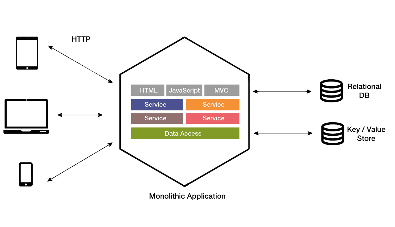 在 Web 应用程序发展的早期,大部分工程是将所有的服务端功能模块打包到单个巨石型(Monolith)应用中,譬如很多企业的 Java 应用程序打包为 war 包,最终会形成如下的架构:
