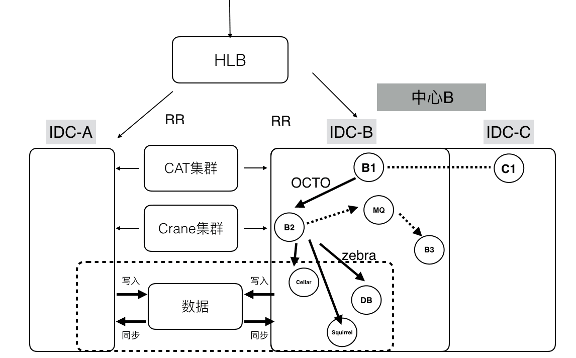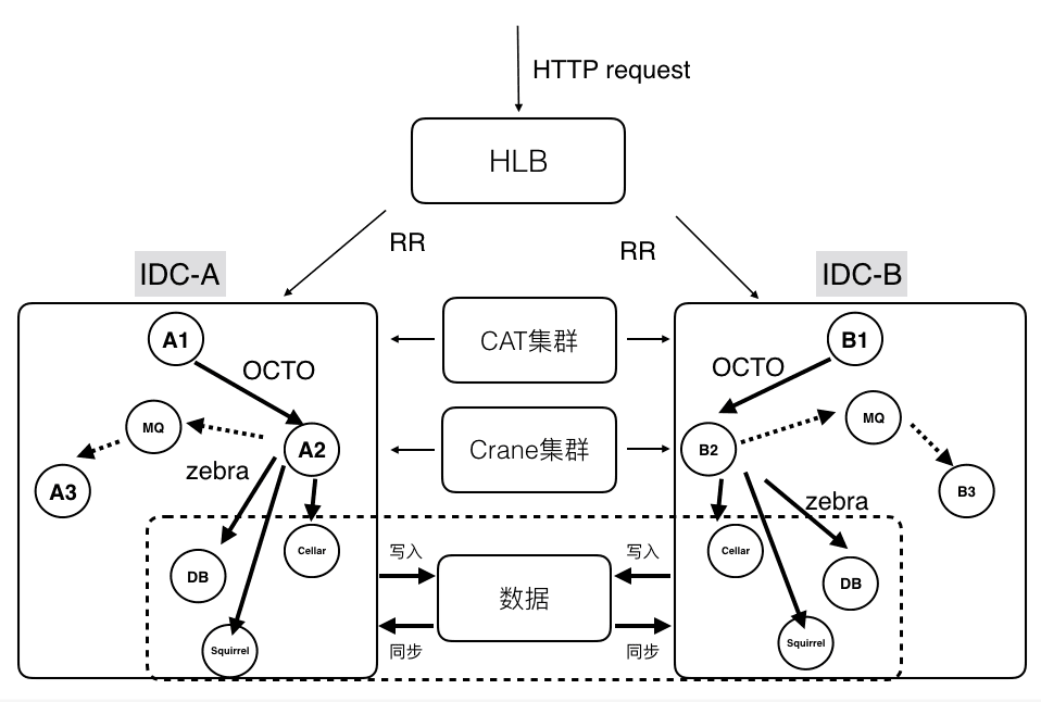上图是比较典型的美团技术体系下的分布式系统结构:依托了美团公共组件和服务,完成了分区扩容、容灾和监控的能力。前端流量会通过HLB来分发和负载均衡;在分区内,服务与服务会通过OCTO进行通信,提供服务注册、自动发现、负载均衡、容错、灰度发布等等服务。当然也可以通过消息队列进行通信,例如Kafka、RabbitMQ。在存储层使用Zebra来访问分布式数据库进行读写操作。利用CAT(美团开源的分布式监控系统)进行分布式业务及系统日志的采集、上报和监控。分布式缓存使用Squirrel+Cellar的组合。分布式任务调度则是通过Crane。
