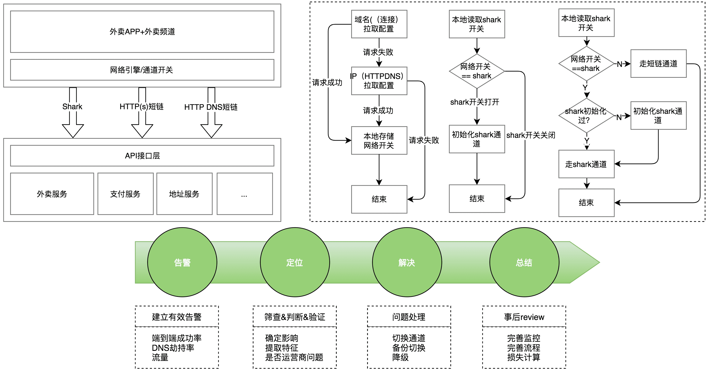 这是美团外卖多网络通道备份示意图。美团外卖客户端拥有Shark、HTTP、HTTPS、HTTP DNS等四条网络通道:整体网络以Shark长连通道为主通道,其余三条通道作为备份通道。配合完备的开关切换流程,可以在网络指标发生骤降时,实现分钟级别的分城市网络通道切换。而通过制定故障应急SOP并不断演练,提升了我们解决问题的能力和速度,有效应对各类网络异常。我们的网络通道开关思路也输出至集团其他部门,有效支持了业务发展。