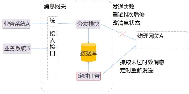 - 物理消息网关宕机,投递失败,有重试机制保证。消息本身不丢失,可以在物理渠道恢复后,重发有效期内的消息。