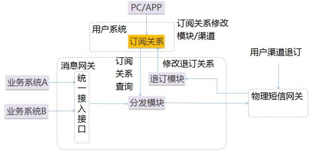 - 用户系统管理用户订阅情况,消息网关管理订阅大类和消息模板的映射。