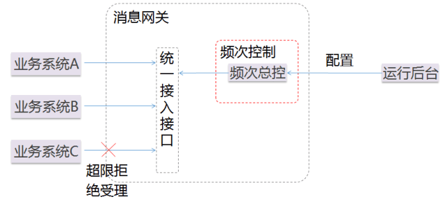图6展示了消息网关在统一接入接口处检查频次控制的情况,对于超过限额的发送请求,会直接拒绝受理。