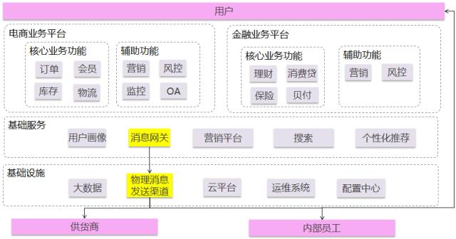 下面介绍一下消息网关在唯品会整体系统中的定位。如图1所示,消息网关定位于基础业务服务层,而物理信道定位在基础设施层,两者之间明确的区分了是否业务相关。