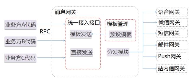对使用消息发送服务的业务方来说,最好的接入方式是访问配置好模板的统一接口(对于需要高度个性化的营销系统,是个例外,营销系统倾向于在系统内部完成消息个性化的逻辑),尽量保持代码接口调用的固定,对于少量变动通过修改配置的方式完成。