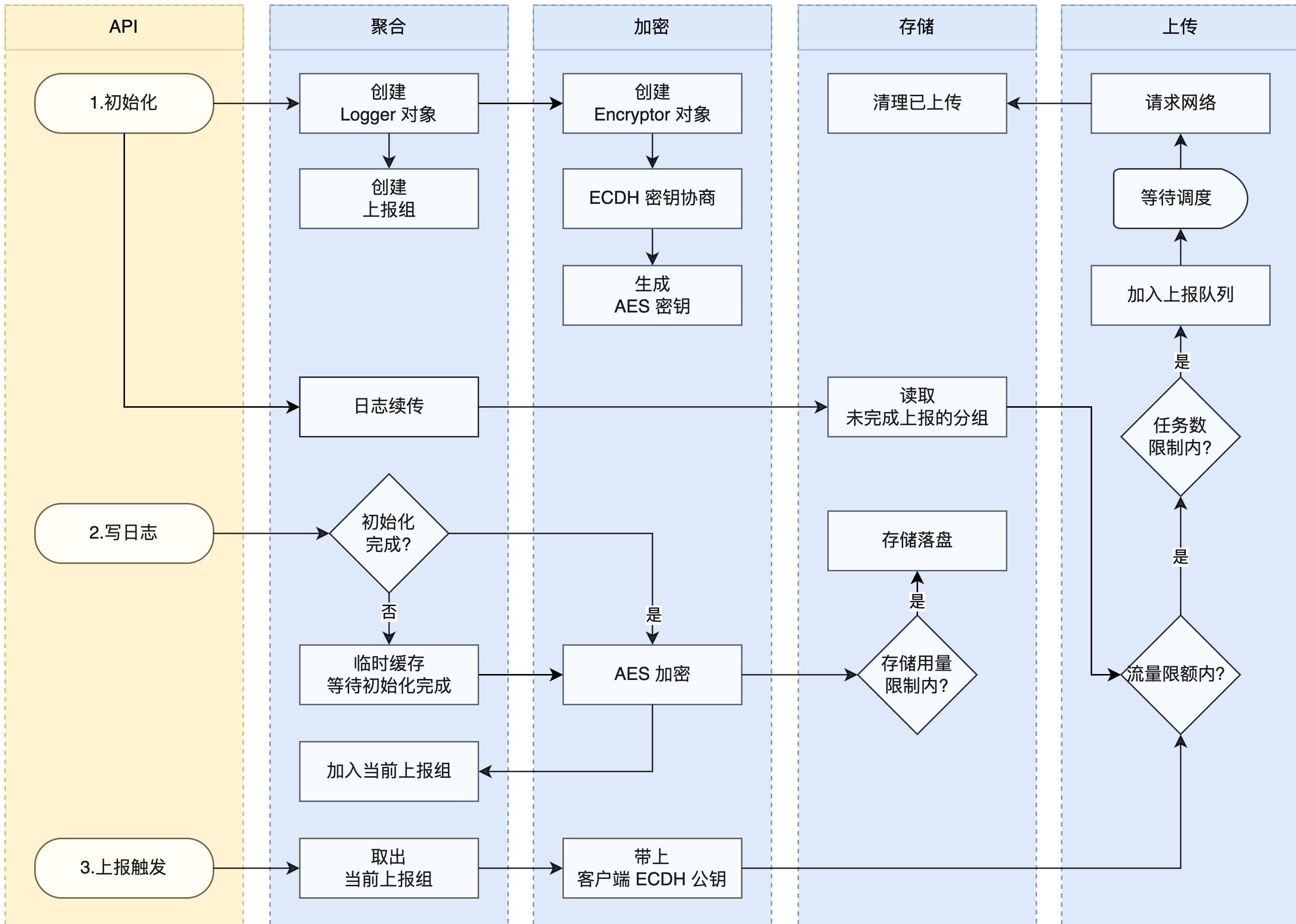 为了方便读者更好地理解端上日志采集过程,下面将具体介绍下采集端流程设计。当采集端初始化 API 开始调用时,先创建 Logger、Encryptor、Storage 等实例对象,并异步拉取环境配置文件。初始化完成之后,先检查是否有成功落盘,但是上报失败的日志,如果有的话立即开始恢复上传流程。当正常调用写日志 API 时,原始日志被加密后加入当前上报组,等到有上报事件(时间、条数、导航等)触发时,当前上报组内的所有日志被加入上报队列并开始上传。采集端详细流程图如下: