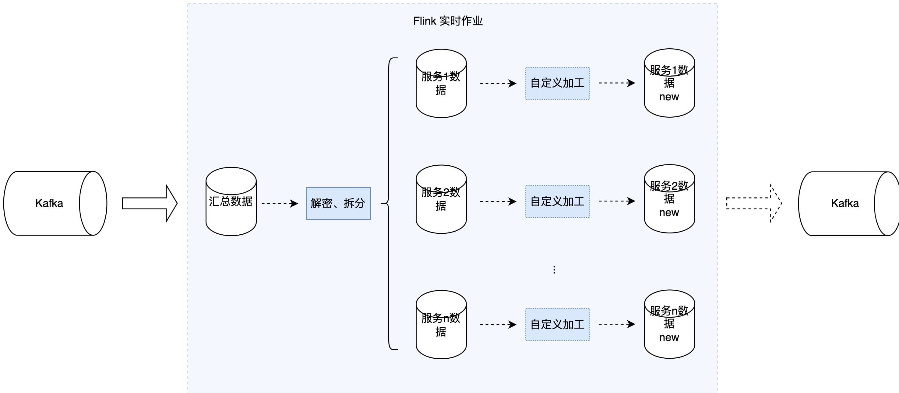 汇总后的日志数据处理和分发依赖于实时计算平台的实时作业能力,底层使用 Flink 数据处理引擎,主要负责日志数据的解析、日志内容的解密以及拆分到下游等。