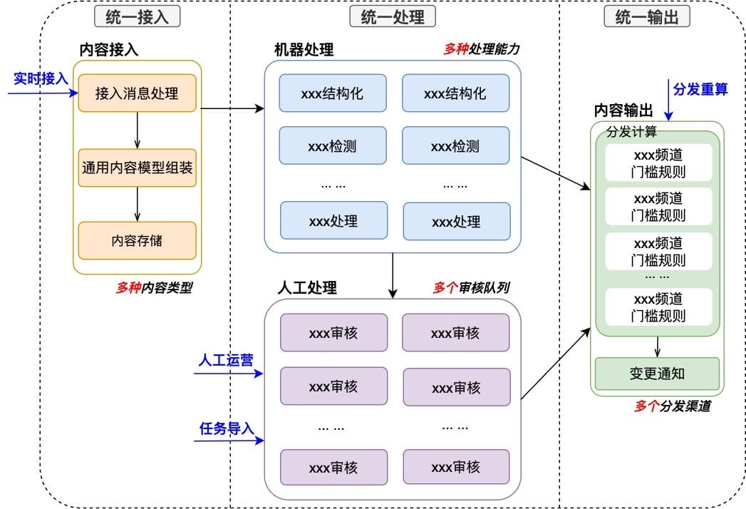 - 统一接入:统一内容数据模型,对接不同的内容生产方,将异构的内容转化为内容平台通用的数据模型。