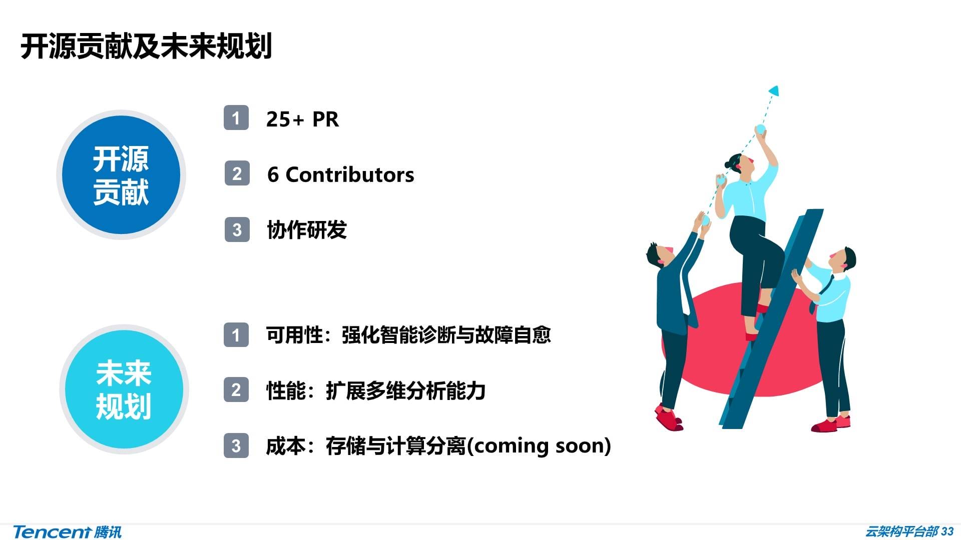 未来,我们将持续的优化 ES,包括可用性,性能和成本等方面。可用性方面我们会加强 ES 的故障自愈能力,朝着自动驾驶的目标发展;性能方面,搜索场景 ES 是绝对的王者,多维分析领域还有很多可优化的地方,我们希望能进一步扩展 ES 在分析领域的应用场景。成本方面,存储与计算分离正在研发中,基于腾讯自研的共享文件系统 CFS,到时会进一步缩减成本,提升性能。