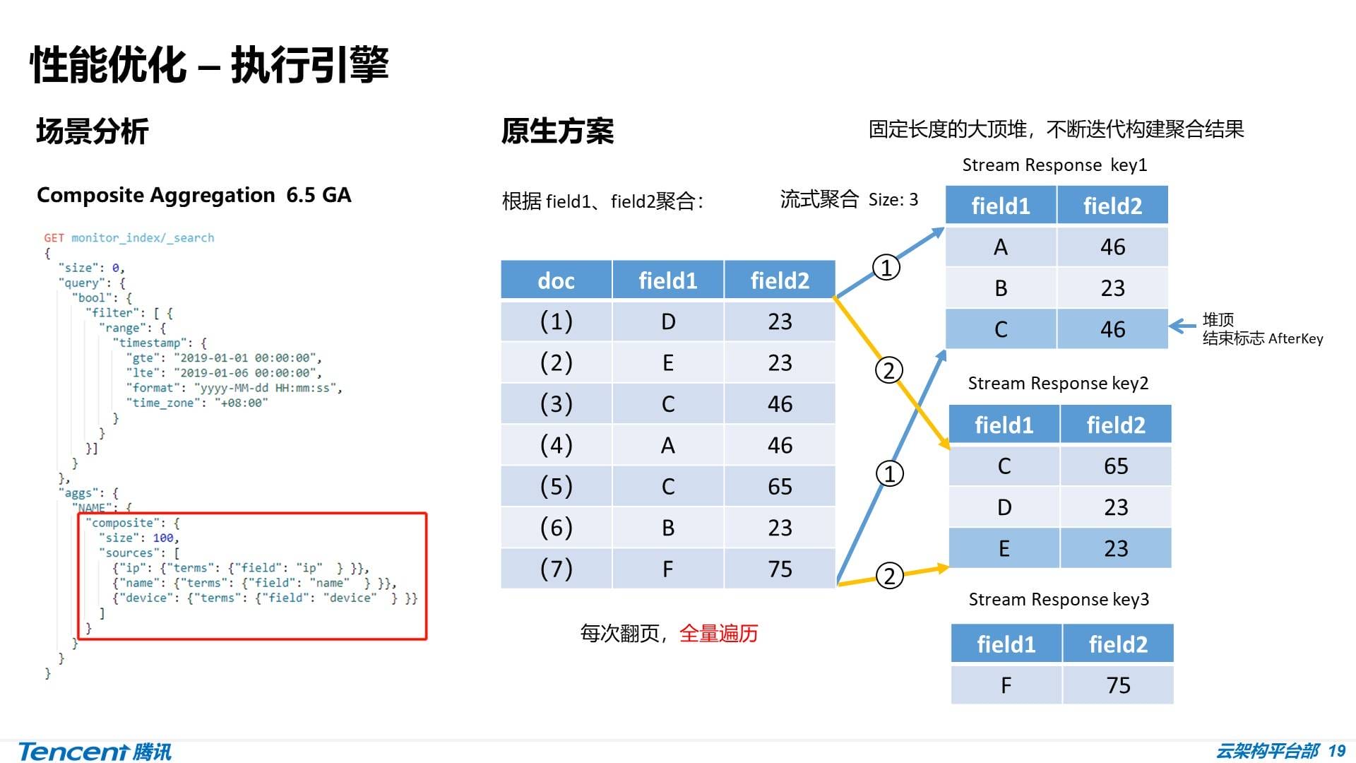 我们拿一个典型的场景来进行分析。ES 里面有一种聚合叫 Composite 聚合大家可能都比较了解,这个功能是在 6.5 版本正式 GA 发布的。它的目的是为了支持多字段的嵌套聚合,类似 MySQL 的 group by 多个字段;另外可以支持流式聚合,即以翻页的形式分批聚合结果。用法就像左边贴的查询时聚合操作下面指定 composite 关键字,并指定一次翻页的长度,和 group by 的字段列表。那么每次拿到的聚合结果会伴随着一个 after key 返回,下一次查询拿着这个 after key 就可以查询下一页的结果。