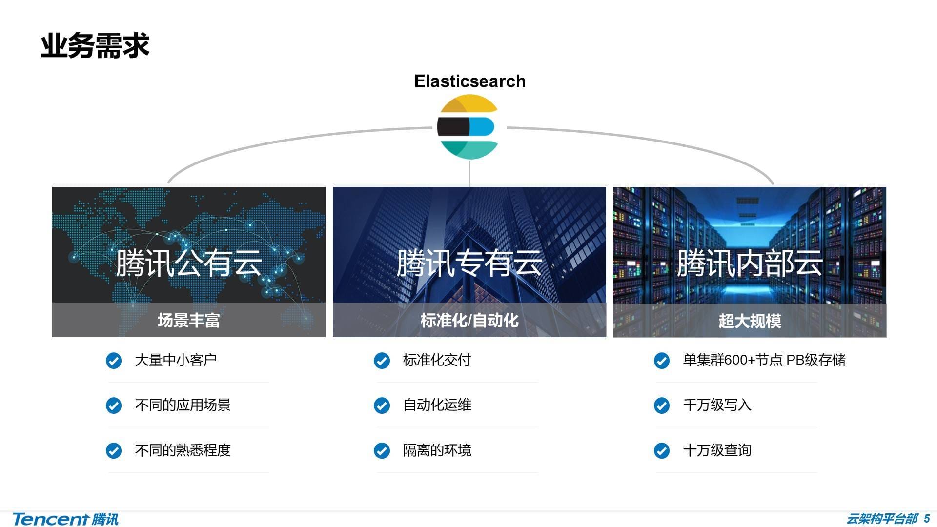 目前 ES 在腾讯公有云、专有云以及内部云上面均有提供服务,可以广泛的满足公司内外客户的业务需求。公有云上的使用场景非常丰富,专有云主要实现标准化交付和自动化运维,腾讯内部云上的 ES 都是 PB 级的超大规模集群。