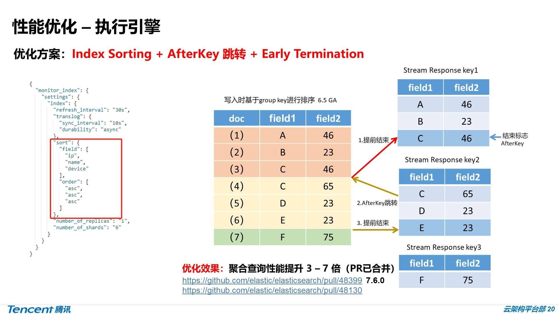 我们的优化方案主要是利用 index sorting 实现 after key 跳转以及提前结束(early termination)。 数据有序才能实现真正的流式聚合,index sorting 也是在 6.5 版本里面引入的,可以支持文档按指定字段排序。但遗憾的是聚合查询并没有利用数据有序性。我们可以进行优化,此时大顶堆我们仍然保留,我们只需要按照文档的顺序提取指定 size 的文档数即可马上返回,因为数据有序。下一次聚合的时候,我们可以直接根据请求携带的 after key 做跳转,直接跳转到指定位置继续向后遍历指定 size 的文档数即可返回。这样避免了每次翻页全量遍历,大幅提升查询性能。这里有一个挑战点,假设数据的顺序和用户查询的顺序不一致优化还能生效吗?实际可以的,逆序场景不能实现 after key 跳转因为 lucene 底层不能支持文档反向遍历,但提前结束的优化仍然生效,仍然可以大幅提升效率。这个优化方案我们是和官方研发协作开发的,因为我们在优化的同时,官方也在优化,但我们考虑的更全面覆盖了数据顺序和请求顺序不一致的优化场景,最终我们和官方一起将方案进行了整合。该优化方案已经在 7.6 合并,大家可以试用体验。