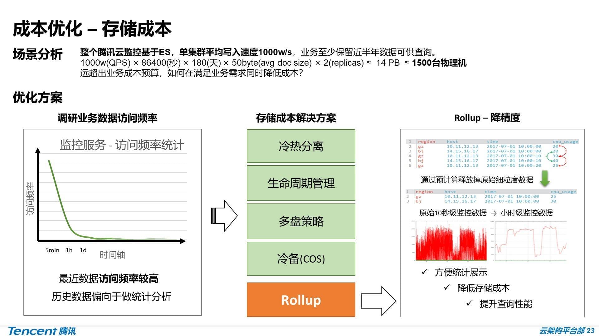 我们先来看一个场景,整个腾讯云监控是基于 ES 的,单个集群平均写入千万每秒,业务需要保留至少半年的数据供查询。我们按照这个吞吐来计算成本,1000 万 QPS 乘以时间乘以单条文档平均大小再乘以主从两个副本总共大约 14 PB 存储,大约需要 1500 台热机型物理机。这显然远远超出了业务成本预算,那我们如何才能既满足业务需求又能实现低成本呢?