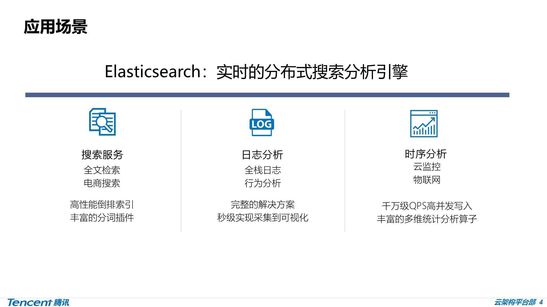 先来看看 ES 在腾讯的主要应用场景。ES 是一个实时的分布式搜索分析引擎,目前很多用户对 ES 的印象还是准实时,实际上在 6.8 版本之后官方文档已经将 near real-time 改为了 real-time: "Elasticsearch provides real-time search and analytics for all types of data." ES 在写入完毕刷新之前,是可以通过 getById 的方式实时获取文档的,只是在刷新之前 FST 还没有构建,还不能提供搜索的能力。 目前 ES 在腾讯主要应用在三个方面: