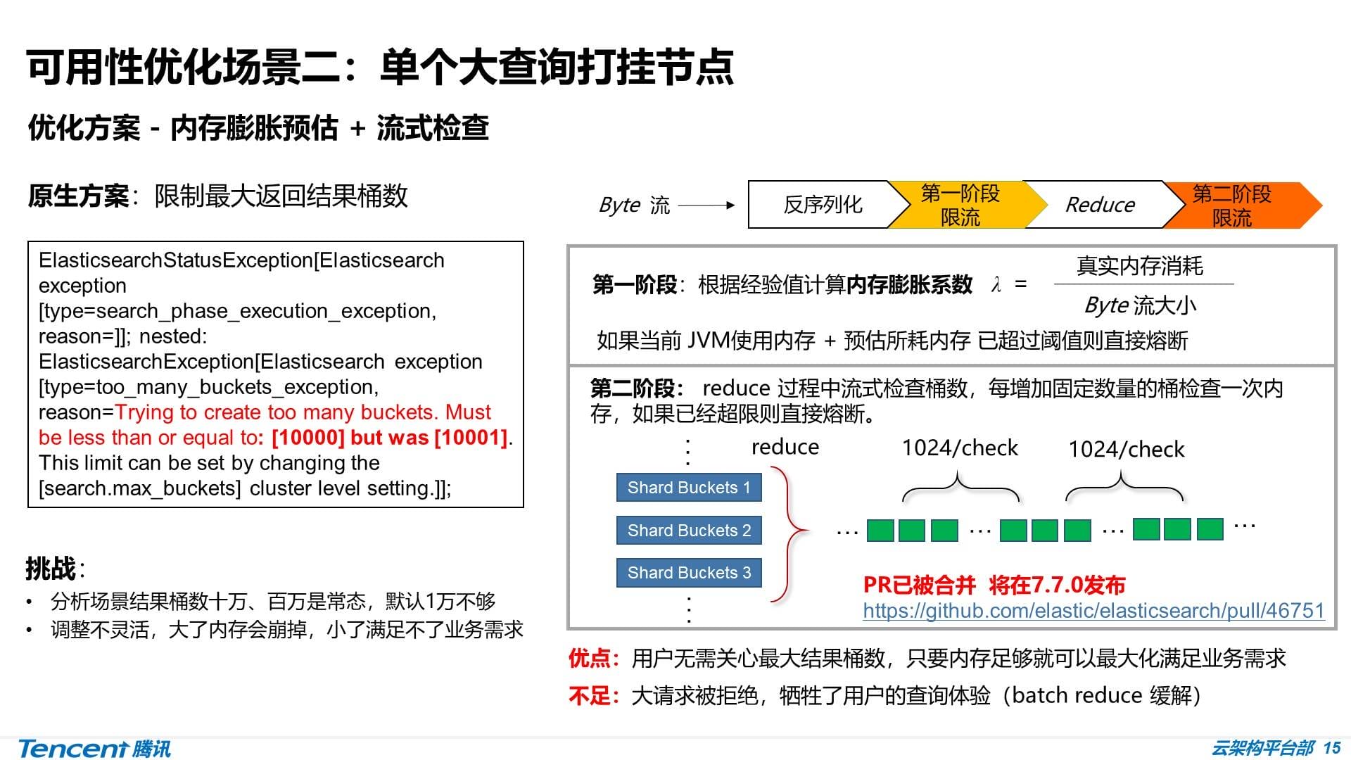 这样用户不再需要关心最大桶数,只要内存足够就能最大化地满足业务需求。不足之处是大请求还是被拒掉了,牺牲了用户的查询体验,但是我们可以通过官方已有的 batch reduce 的方式缓解,就是当有 100 个分片子结果的时候,每收到部分就先做一次聚合,这样能降低单次聚合的内存开销。上面流式聚合的整体方案已经提交给官方并合并了,将在最近的 7.7.0 版本中发布。