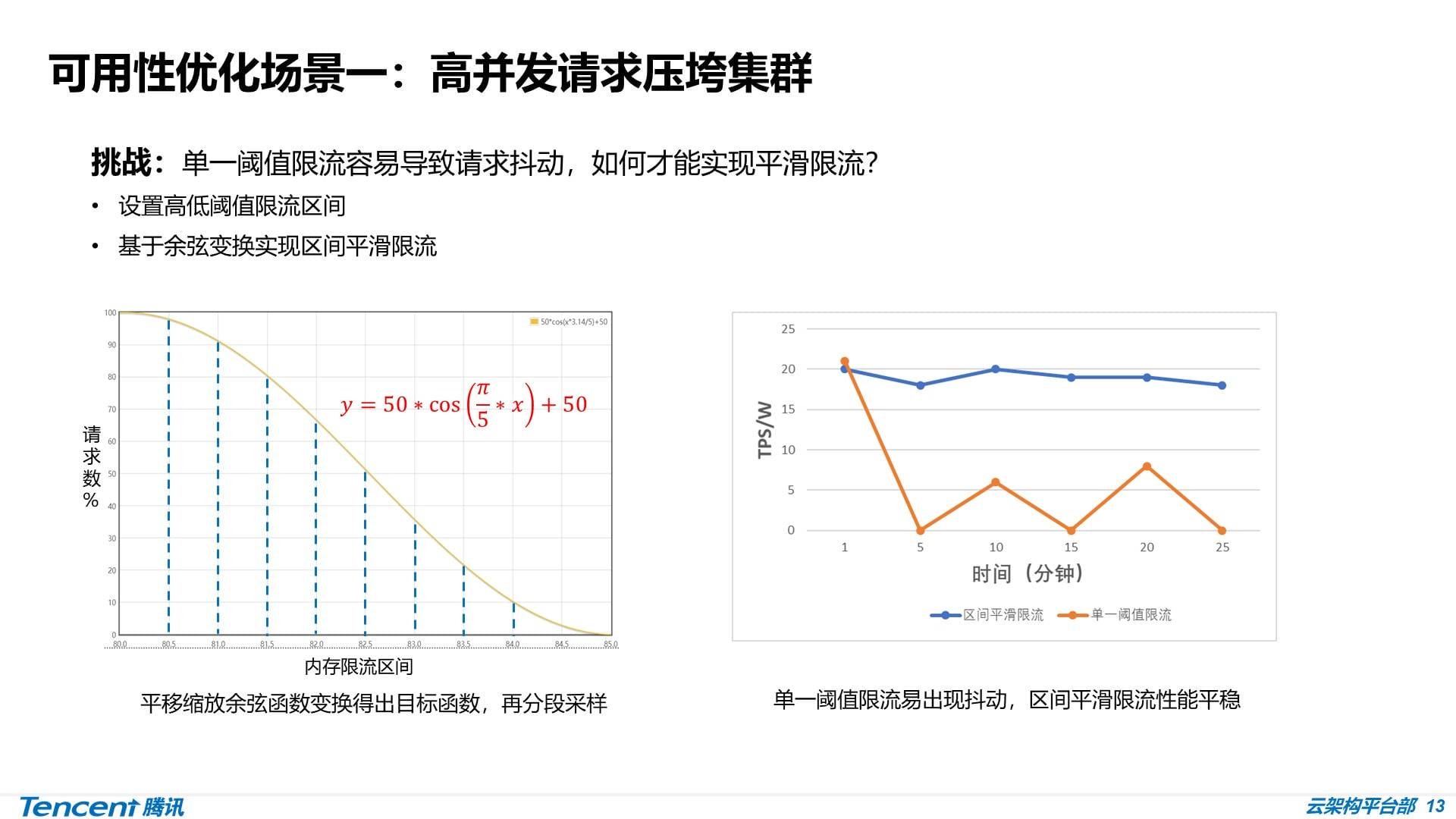 限流方案里面有一个挑战是,我们如何才能实现平滑限流?因为采用单一的阈值限流很容易出现请求抖动,例如请求一上来把内存打上去马上触发限流,而放开一点点请求又会涌进来把内存打上去。我们的方案是设置了高低限流阈值区间,在这个区间中,基于余弦变换实现请求数和内存资源之间的平滑限流。当内存资源足够的时候,请求通过率 100%,当内存到达限流区间逐步上升的时候,请求通过率随之逐步下降。而当内存使用量下降的时候,请求通过率也会逐步上升,不会一把放开。通过实际测试,平滑的区间限流能在高压力下保持稳定的写入性能。