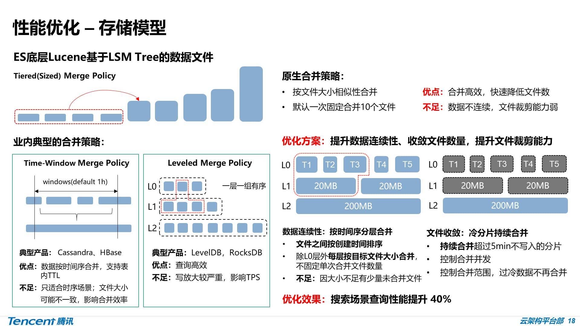 首先是存储模型优化。我们知道 ES 底层 Lucene 是基于 LSM Tree 的数据文件。原生默认的合并策略是按文件大小相似性合并,默认一次固定合并 10 个文件,近似分层合并。这种合并方式的最大优点是合并高效,可以快速降低文件数;主要问题是数据不连续,这样会导致我们在查询的时候文件裁剪的能力很弱,比如查询最近一小时的数据,很有可能一小时的文件被分别合并到了几天前的文件中去了,导致需要遍历的文件增加了。