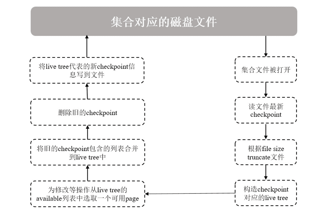 当新的checkpoint生成时,会重新刷新其allocated、available、discard三个列表中的信息,并计算此时集合文件的大小以及rootpage的位置、大小、checksum等信息,将这些信息作checkpoint元信息写入文件;