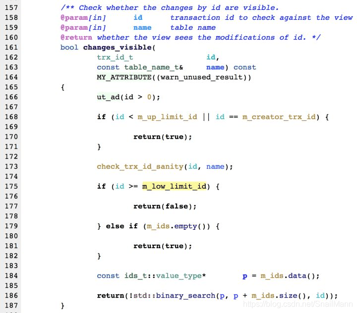 我们这里盗窃@呵呵一笑百媚生一张源码图,如上,它是一段MySQL判断可见性的一段源码,即changes_visible方法(不完全哈,但能看出大致逻辑),该方法展示了我们拿DB_TRX_ID去跟Read View某些属性进行怎么样的比较