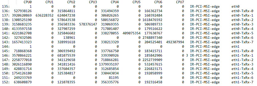 我们线上的CPU一般是48个逻辑core,就会生成48个中断号,由于我们是两块网卡做了bond,也就会生成96个中断号。