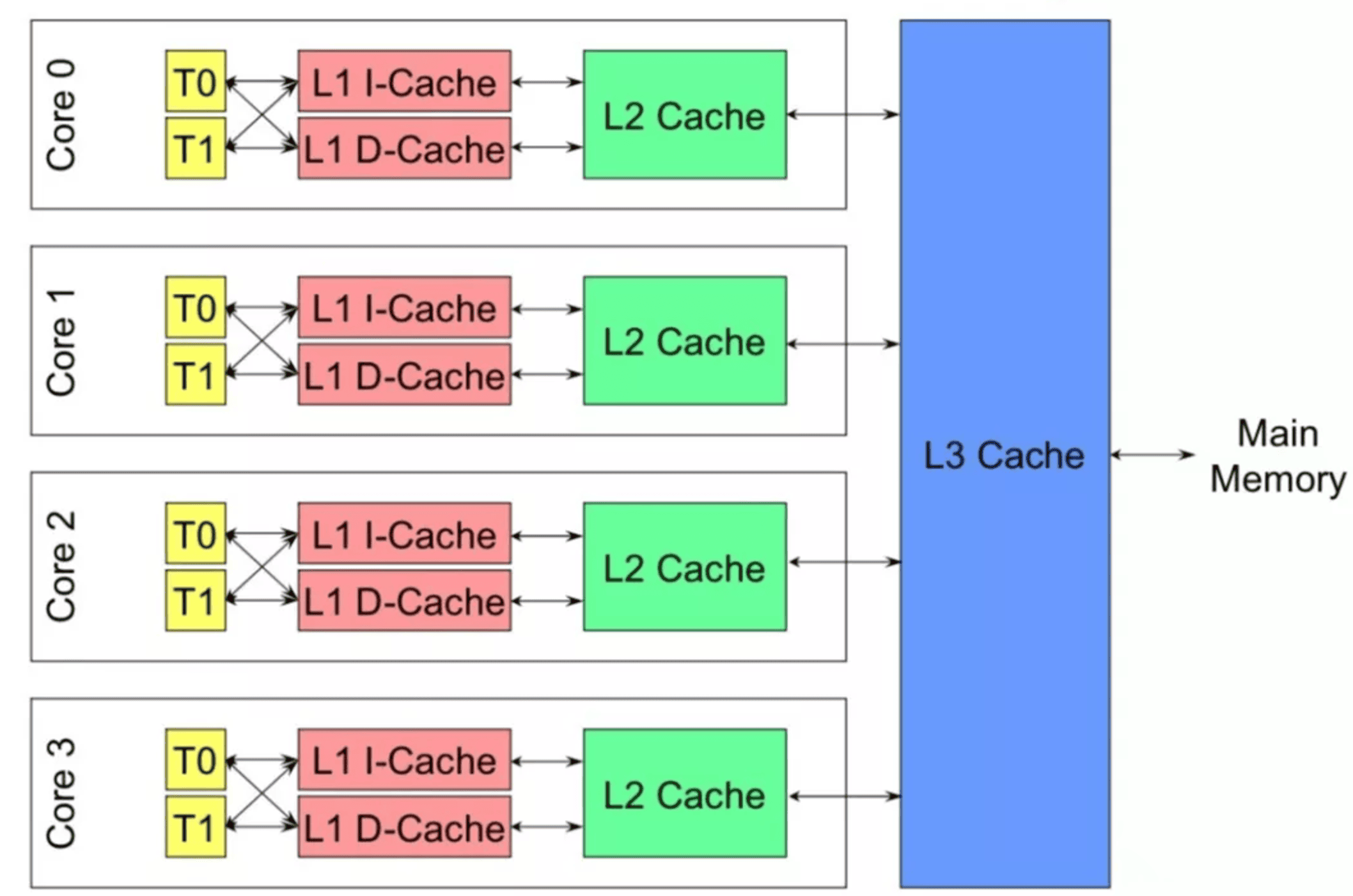 SMP 结构:一个物理CPU可以有多个物理Core,每个Core又可以有多个硬件线程。即:每个HT有一个独立的L1 cache,同一个Core下的HT共享L2 cache,同一个物理CPU下的多个core共享L3 cache。