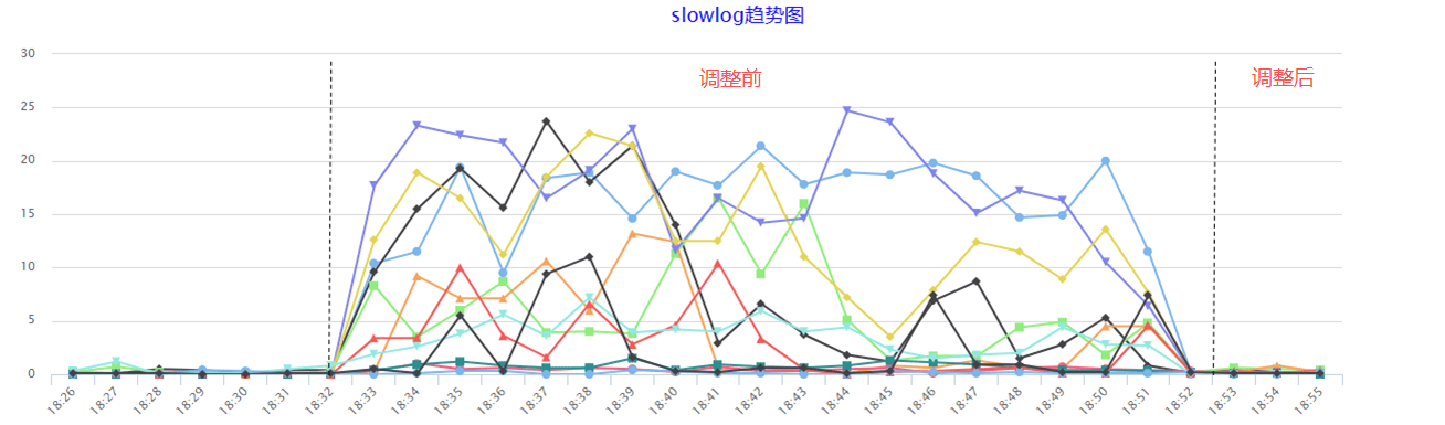 使用命令taskset可以为进程设置CPU亲缘性,操作十分简单,一句taskset -cp cpu-list pid即可完成绑定。经过一番压测,我们发现使用8个core处理中断时,流量直至打满双万兆网卡也不会出现丢包,因此决定将中断的亲缘性设置为物理机上前8个core,Redis进程的亲缘性设置为剩下的所有core。调整后,确实有明显的效果,慢查询数量大幅优化,但对比初始情况,仍然还是高了一些些,还有没有优化空间呢?