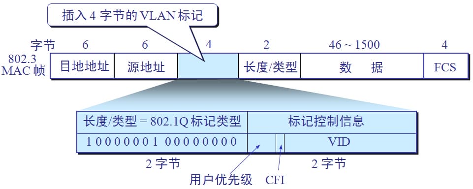 虚拟局域网协议允许在以太网的帧格式中插入一个 4 字节的标识符,称为 VLAN 标记(tag),用来指明发送该帧的工作站属于哪一个虚拟局域网。