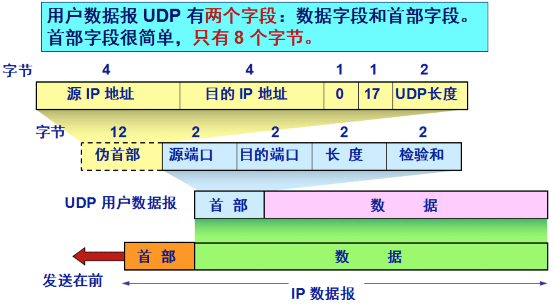 在计算检验和时,临时把"伪首部"和 UDP 用户数据报连接在一起。伪首部仅仅是为了计算检验和。