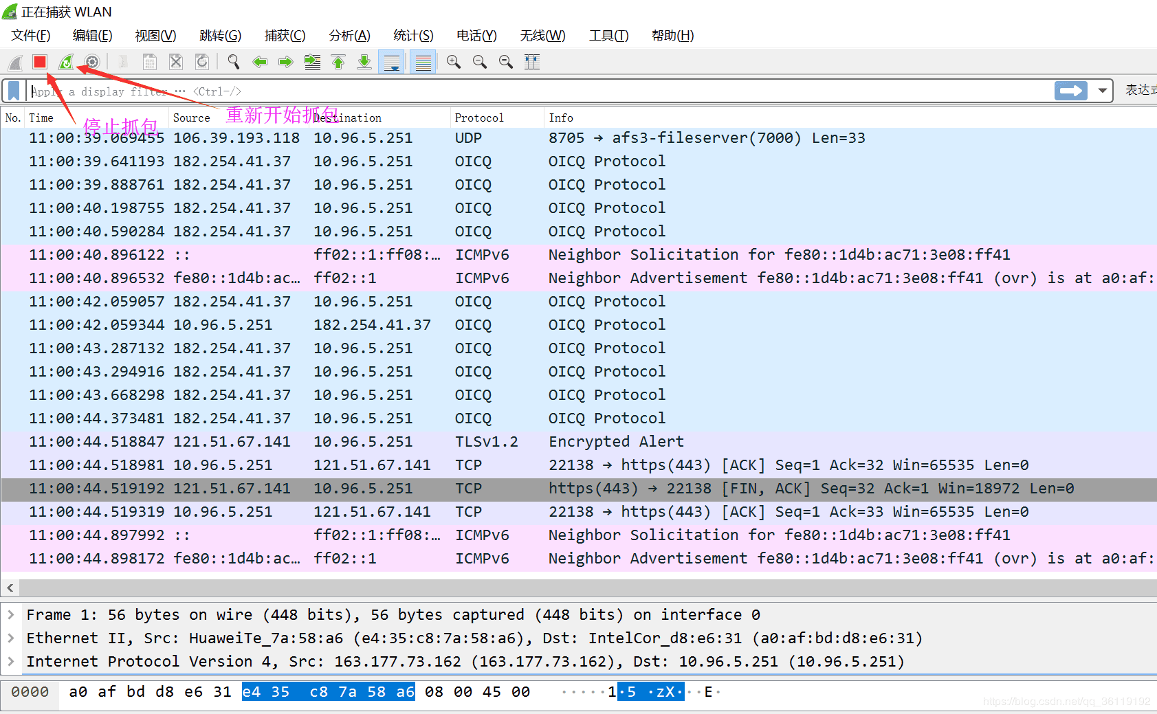 双击选择了网卡之后,就开始抓包了
