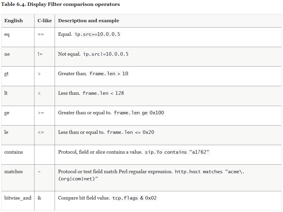 过滤关系就是大于、小于、等于等几种等式关系,我们可以直接看官方给出的表。注意其中有"English"和"C-like"两个字段,这个意思是说"English"和"C-like"这两种写法在wireshark中是等价的、都是可用的。