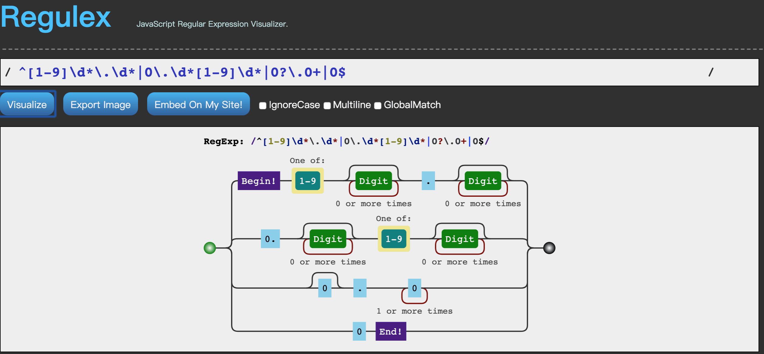 以 正浮点数 为例子:^[1-9]\d*\.\d*|0\.\d*[1-9]\d*|0?\.0+|0$, 你将可以非常直观的看到它的流程: