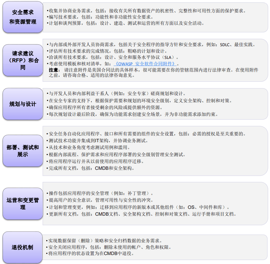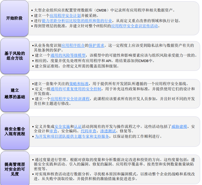 OWASP建议这些企业组织建立一个应用程序安全计划,深入了解并改善它们的应用程序组合的安全性。为了实现应用程序的安全性,需要企业组织中的不同部门之间有效地协同工作,这包括安全和审计、软件开发、商业和执行管理。安全应该可视化和可量化,让所有不同角色的人都可以看到并理解企业组织的应用程序的安全态势。通过消除或降低风险的方式专注于活动和结果,以帮助提高企业安全性。《OWASP SAMM》 在新窗口打开 (opens new window)和首席信息官的《OWASP应用安全指南》 在新窗口打开 (opens new window)是这个列表中大多数关键活动的来源。