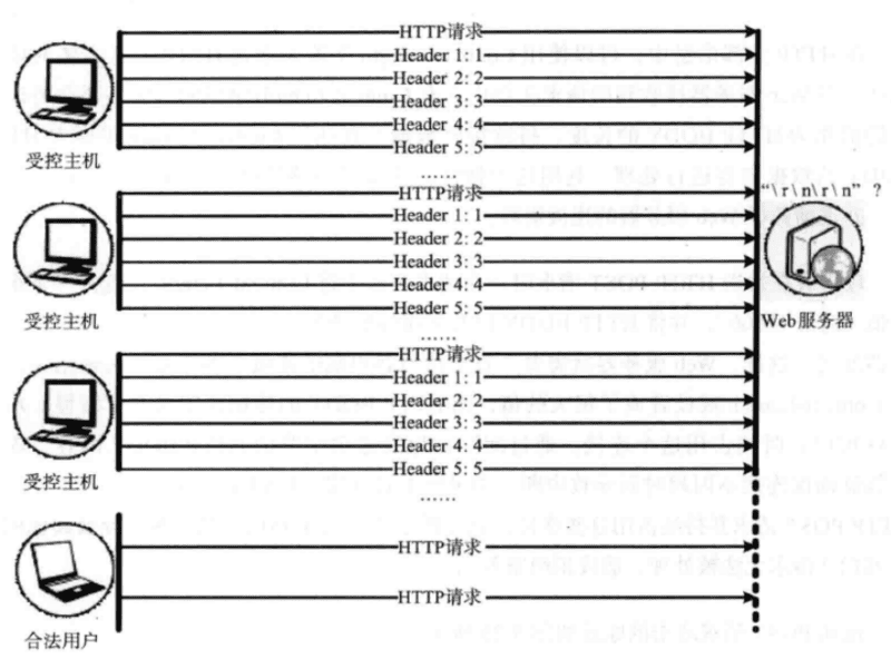 攻击者在发送HTTP GET请求时,缓慢的发送无用的header字段,并且一直不发送"rnrn"结束标志,这样就能够长时间占用与Web服务器的连接并保证该连接不被超时中断,然而,Web服务器能够处理的并发连接数是有限的,如果攻击者利用大量的受控主机发送这种不完整的HTTP GET请求并持续占用这些连接,就会耗尽Web服务器的连接资源,导致其他用户的HTTP请求无法被处理,造成拒绝服务。