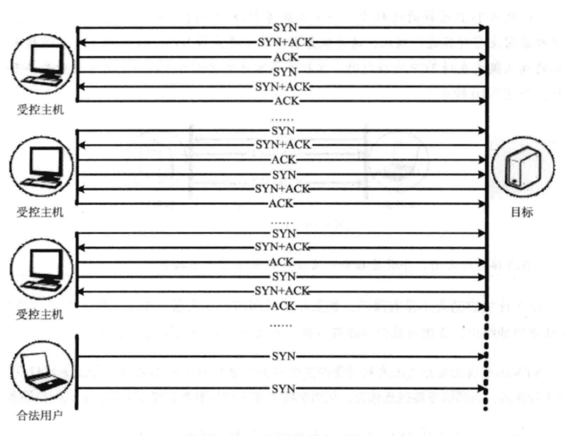 在建立TCP连接的过程中,如果在服务器返回SYN+ACK报文后,客户端由于某种原因没有对其进行确认,这时服务器端就需要重传SYN+ACK报文,并等待客户端的确认报文直到TCP连接超时,这种等待客户确认的连接状态通常被称为半开连接。 在连接超时之前,半开连接会一直保存在服务器的连接表中。 由于连接表的大小是有限的,如果在短时间内产生大量的半开连接,而这些连接又无法很快的结束,连接表就会很快被占满,导致新的连接TCP连接无法建立。
