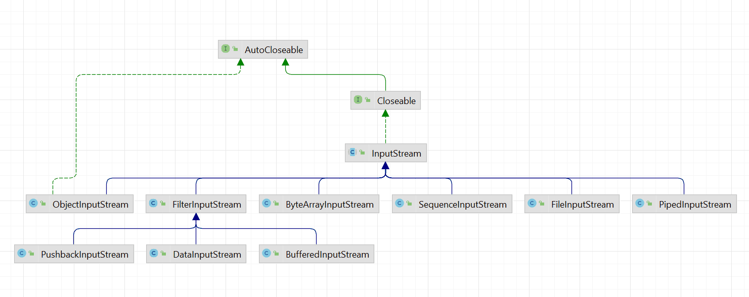InputStream是输入字节流,具体的实现类层次结构如下: