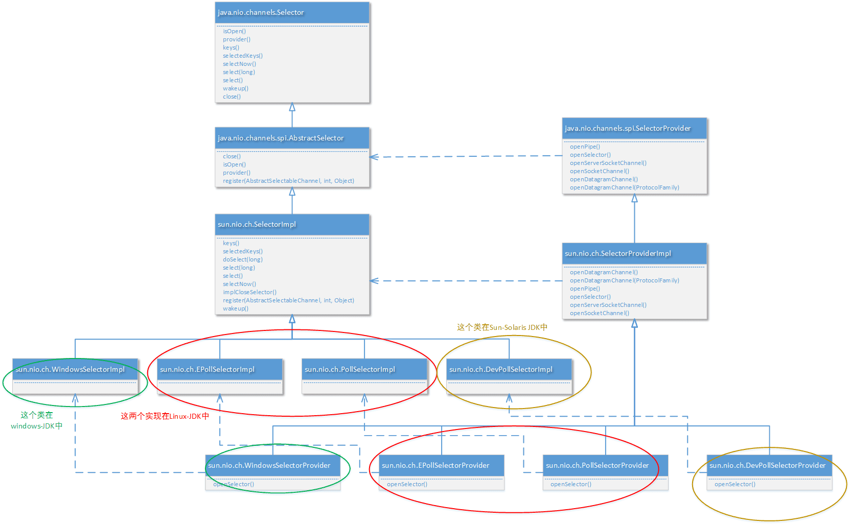 实际上通过每一个AbstractSelectableChannel子类所实现的public final int validOps()方法,就可以查看这个通道"可以关心的IO事件"。