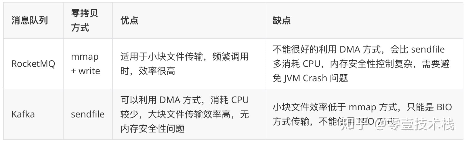 RocketMQ 选择了 mmap + write 这种零拷贝方式,适用于业务级消息这种小块文件的数据持久化和传输;而 Kafka 采用的是 sendfile 这种零拷贝方式,适用于系统日志消息这种高吞吐量的大块文件的数据持久化和传输。但是值得注意的一点是,Kafka 的索引文件使用的是 mmap + write 方式,数据文件使用的是 sendfile 方式。