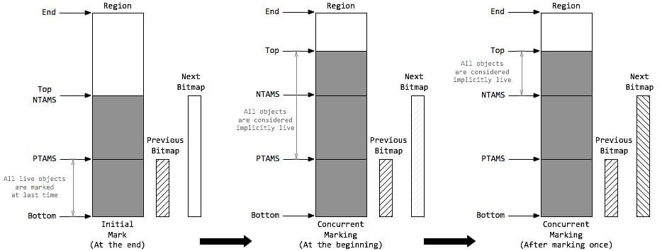 要标记存活的对象,每个分区都需要创建位图(Bitmap)信息来存储标记数据,来确定标记周期内被分配的对象。G1采用了两个位图Previous Bitmap、Next Bitmap,来存储标记数据,Previous位图存储上次的标记数据,Next位图在标记周期内不断变化更新,同时Previous位图的标记数据也越来越过时,当标记周期结束后Next位图便替换Previous位图,成为上次标记的位图。同时,每个分区通过顶部开始标记(TAMS),来记录已标记过的内存范围。同样的,G1使用了两个顶部开始标记Previous TAMS(PTAMS)、Next TAMS(NTAMS),记录已标记的范围。