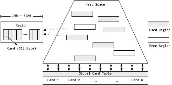 在每个分区内部又被分成了若干个大小为512 Byte卡片(Card),标识堆内存最小可用粒度所有分区的卡片将会记录在全局卡片表(Global Card Table)中,分配的对象会占用物理上连续的若干个卡片,当查找对分区内对象的引用时便可通过记录卡片来查找该引用对象(见RSet)。每次对内存的回收,都是对指定分区的卡片进行处理。