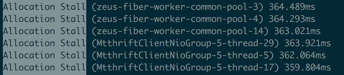 日志信息:对比出现性能毛刺时间点的GC日志和业务日志,发现JVM停顿了较长时间,且停顿时GC日志中有大量的"Allocation Stall"日志。