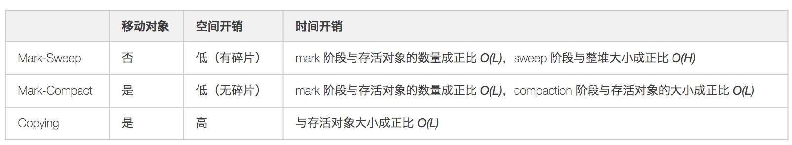 三种算法在是否移动对象、空间和时间方面的一些对比,假设存活对象数量为 L 、堆空间大小为 H,则: