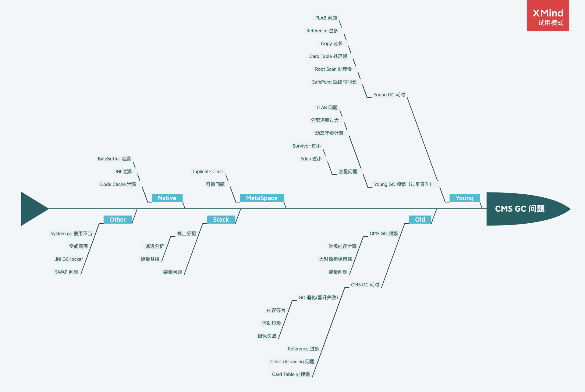 送上一张问题根因鱼骨图,一般情况下我们在处理一个 GC 问题时,只要能定位到问题的"病灶",有的放矢,其实就相当于解决了 80%,如果在某些场景下不太好定位,大家可以借助这种根因分析图通过排除法去定位。